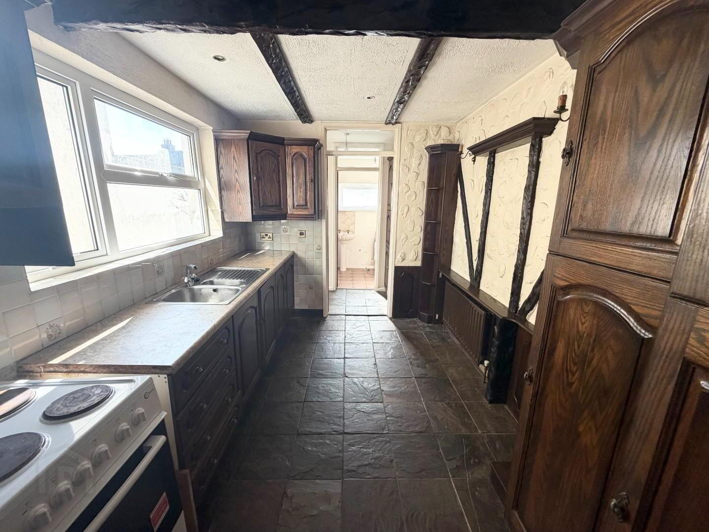 - High and low level units, 11/2 stainless steel sink and drainer, fridge freezer, wired for electric cooker, part tiled wall, tiled floor. Roof beams.