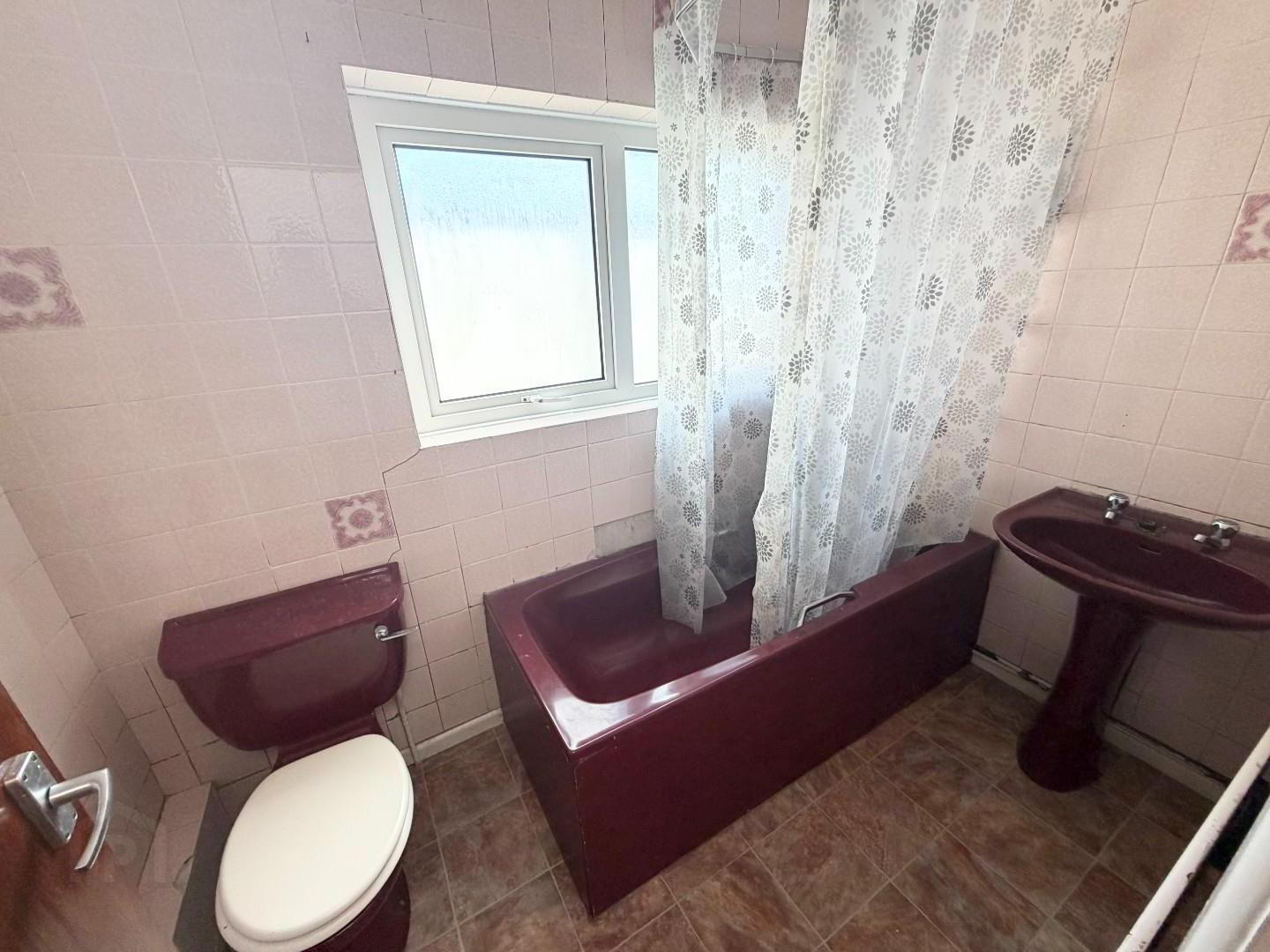 - Original burgundy suite with panel bath, pedestal wash hand basin, LFWC, tiled wall, extractor.