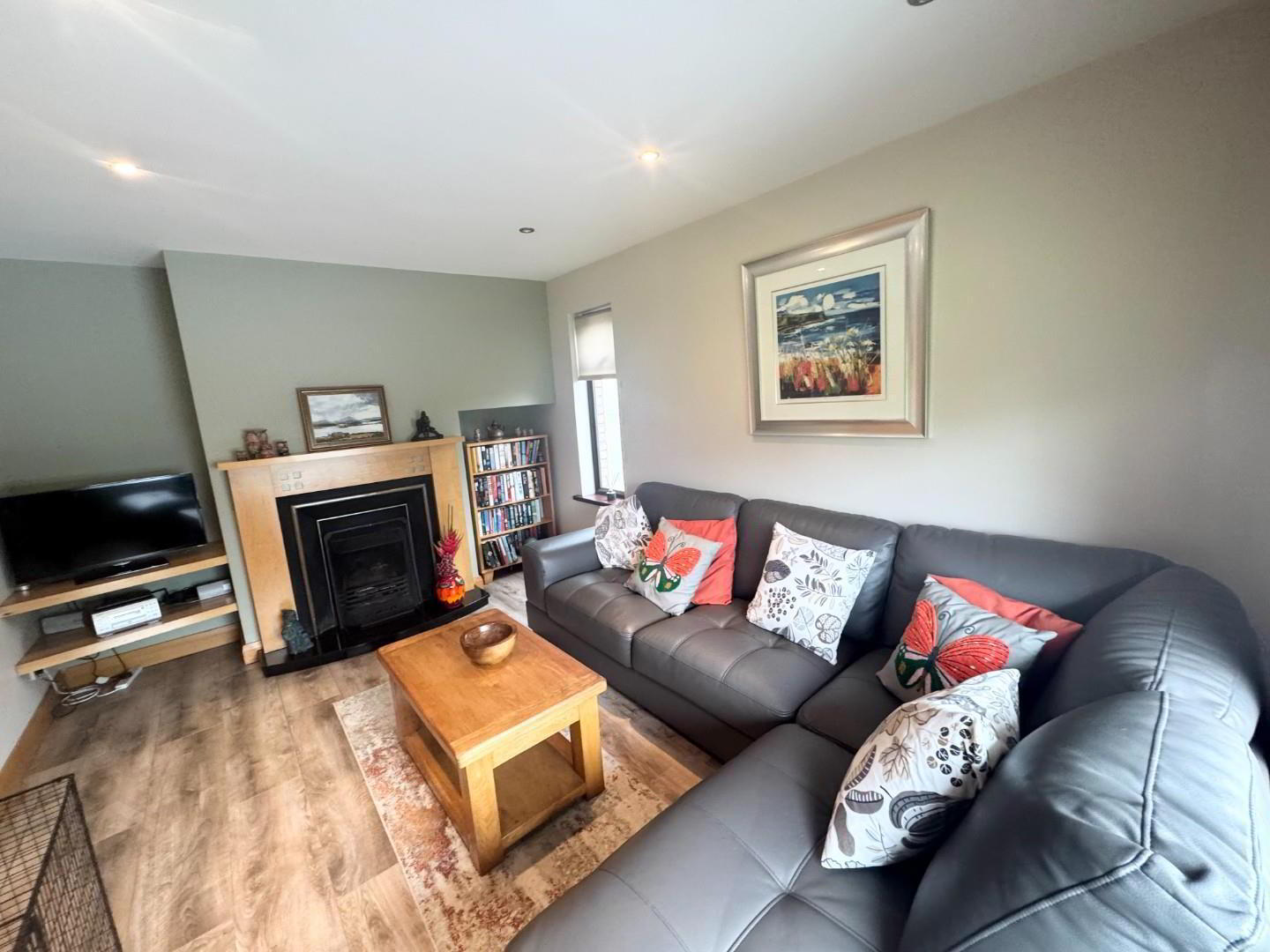 - Cosy room with laminate flooring and open fire with wood surround and granite tile fireplace. recessed lights.
