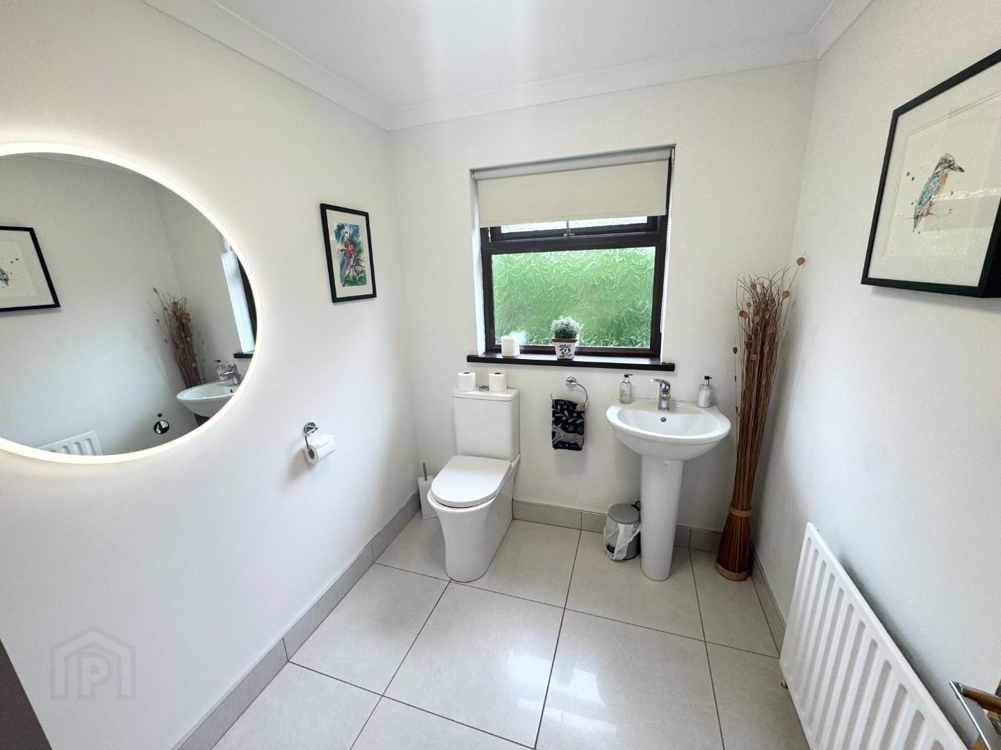 - Modern suite consisting of LFWC, pedestal wash hand basin, fully tiled floor, radiator , fitted mirror with ring light.