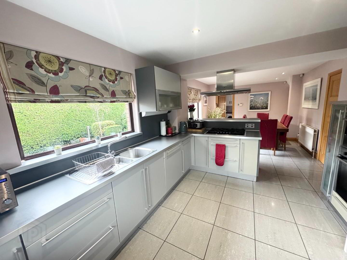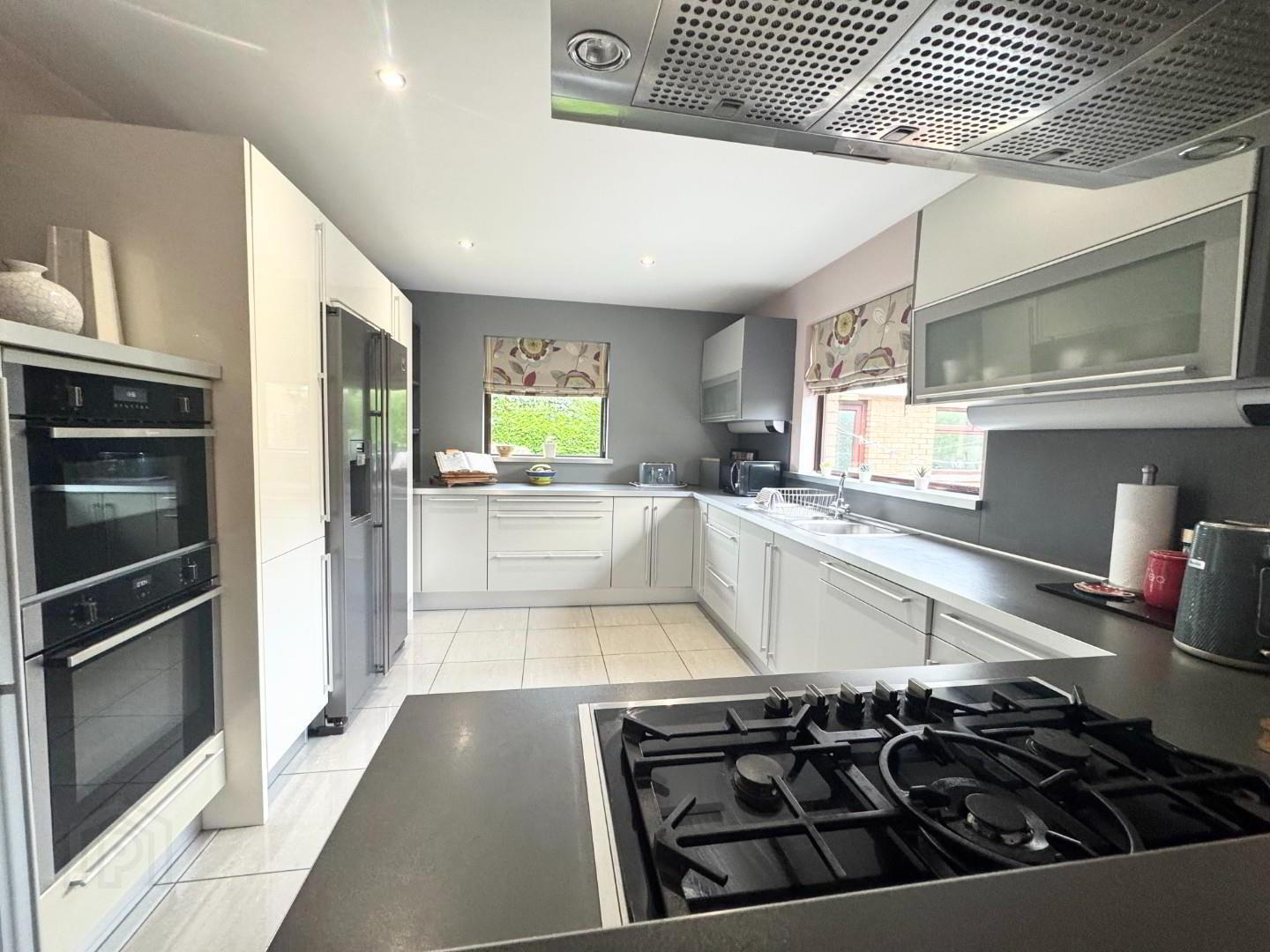 - This great bright spacious room ideal for socializing, has a modern kitchen with high and low level units, 11/2 stainless steel sink and drainer, integrated gas 5 ring hob with stainless steel extractor above, double electric ovens, plumbed for American fridge freezer, integrated dishwasher, breakfast bar area and large dining area , fully tiled floor, recessed lights, flows to sun room.