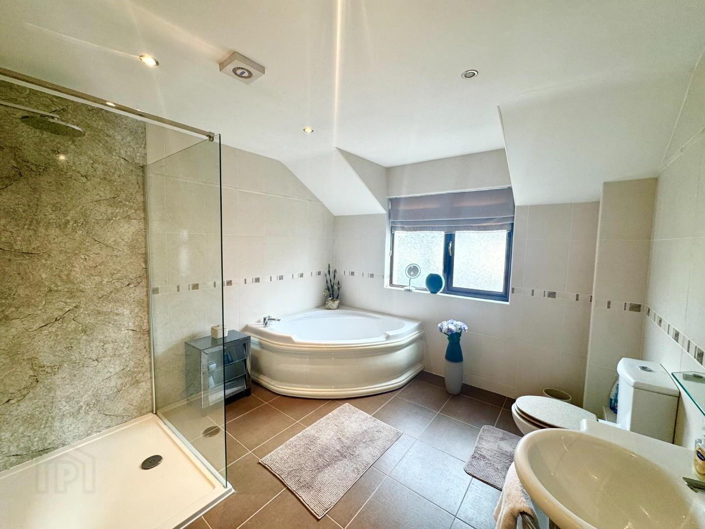- White suite with fully tiled wall and floor, LFWC, panel corner bath, wall mounted wash hand basin, large double walk in shower with rain drop shower head and detachable shower head. extractor and radiator.