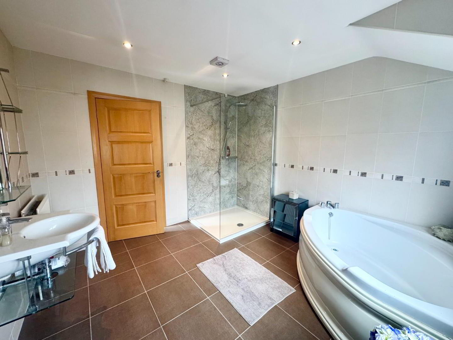 - Modern bathroom with white suite fully tiled walls and floor, with LFWC, wall mounted wash hand basin, double shower unit with pressure shower, and glass doors, extractor and radiator.