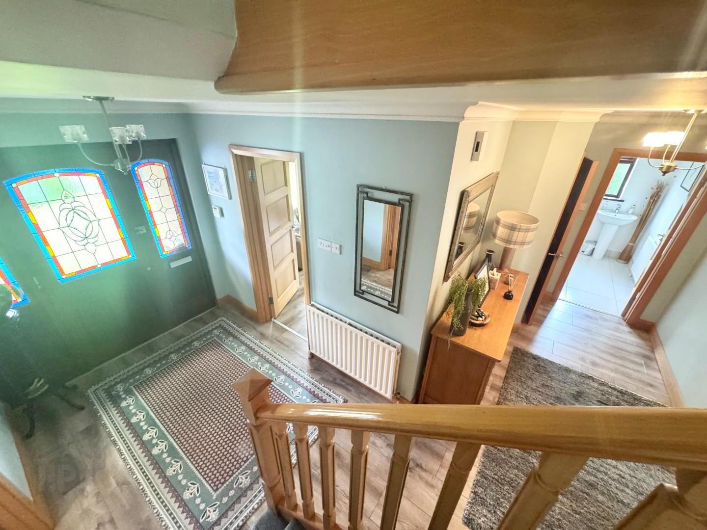 - Lead glass design front door to spacious hallway with laminate flooring, under stairs storage and storage cupboard. Ceiling cornicing.