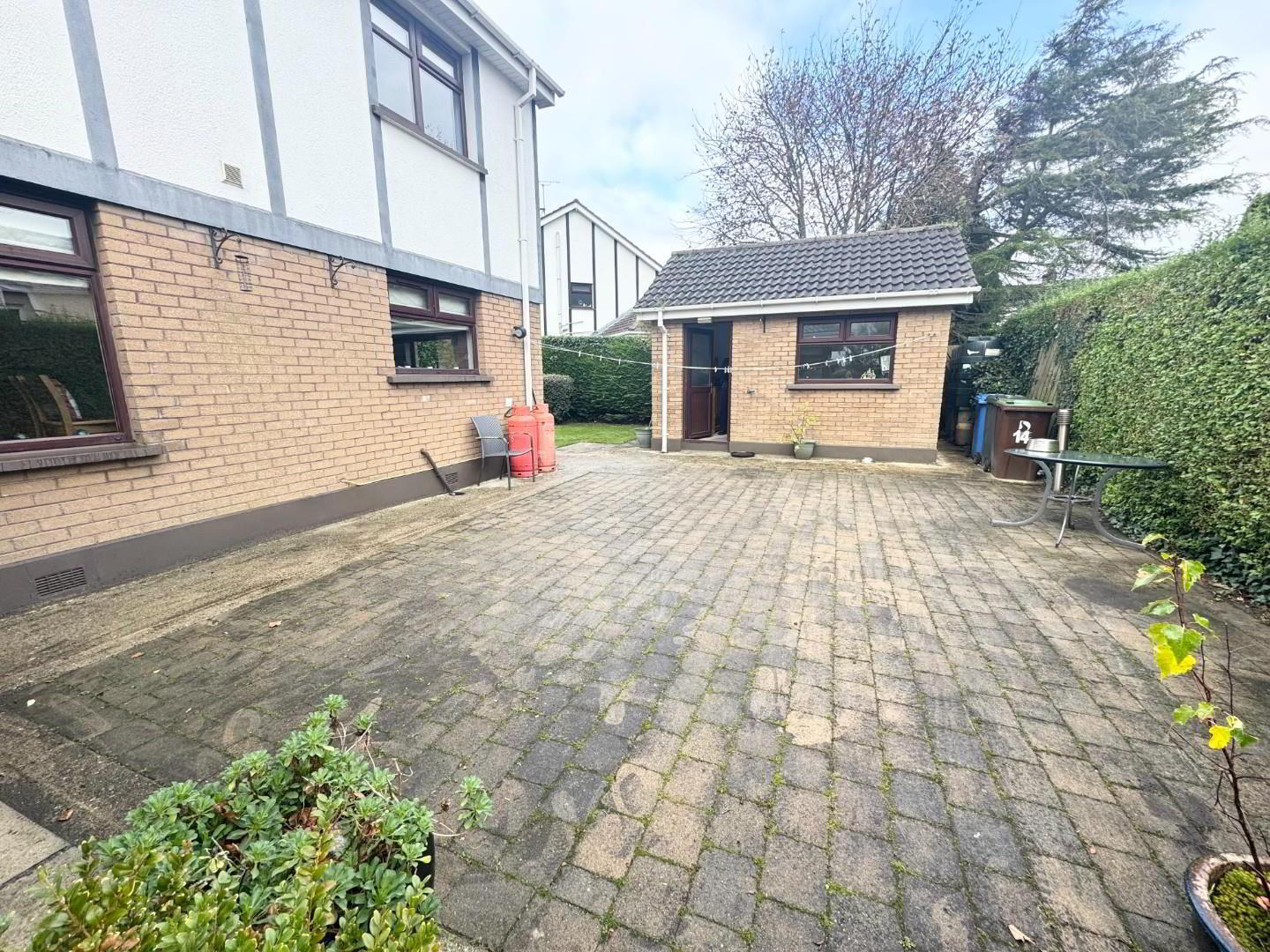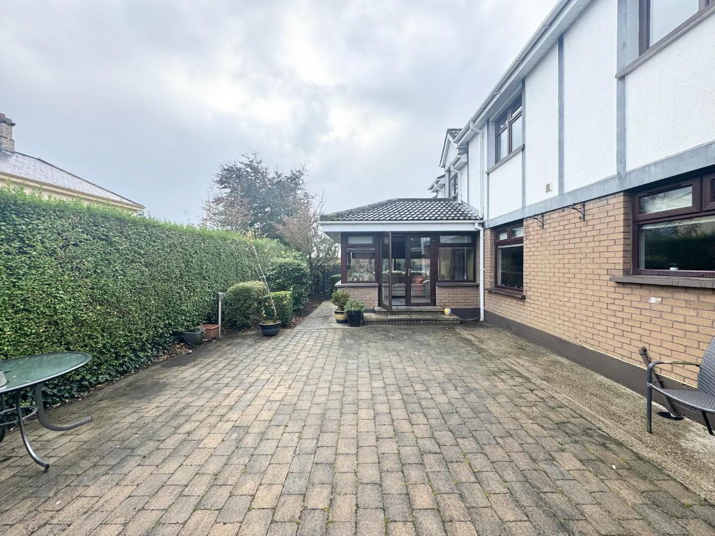 - The rear is brick paved with access from the sun room and gets the sun all day.