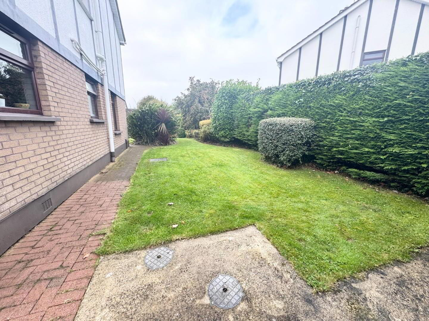 The side and front are in lawn and shrubs with a brick paved driveway for 3 cars.