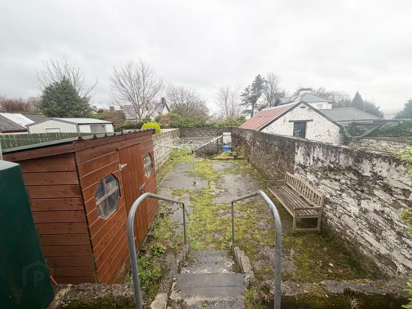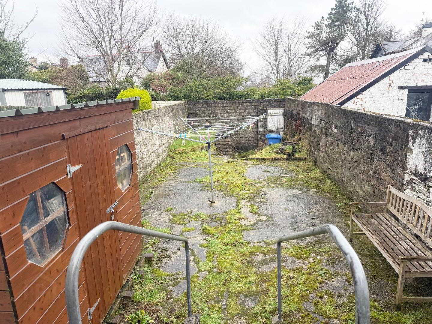 - Front has a small concrete area with a wall and gate.