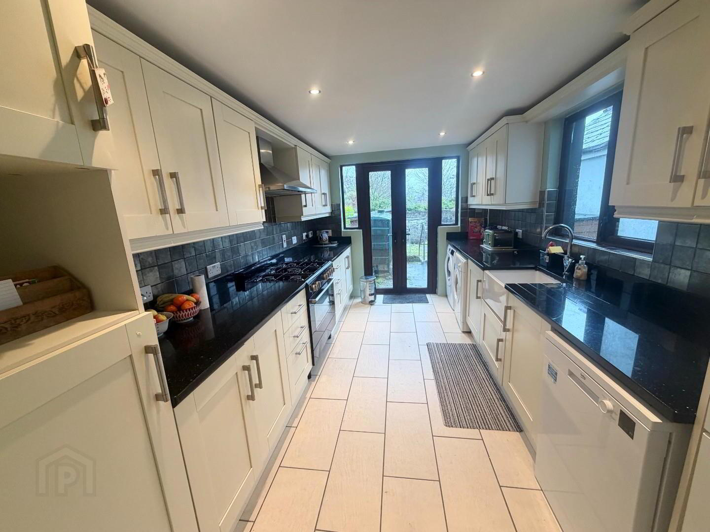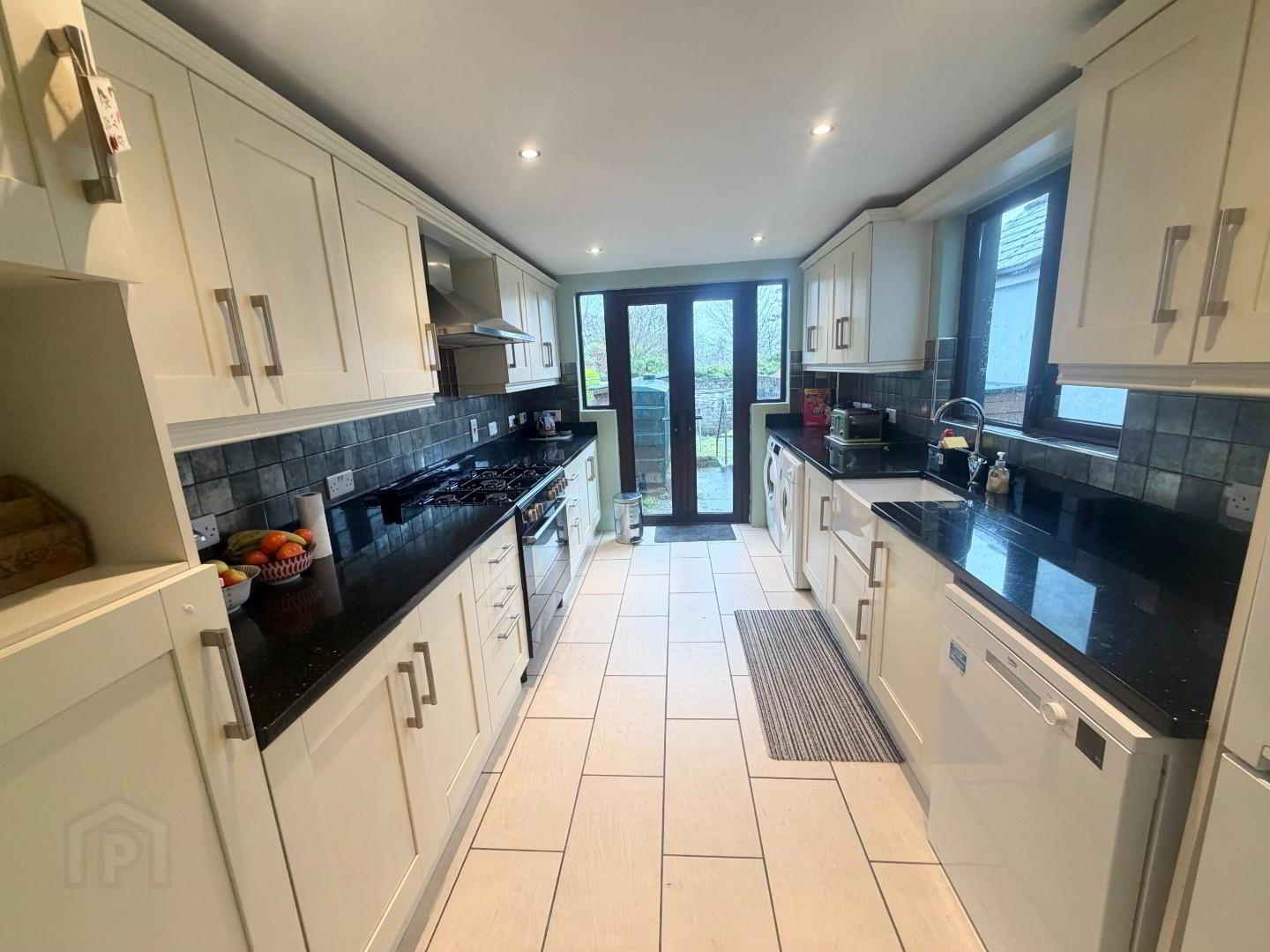 - Modern kitchen with high and low units, plumbed for washing machine, dryer, dishwasher and ridge freezer, also piped for gas cooker with stainless steel extractor above, tiled floor, part tiled wall. double doors to patio and garden.