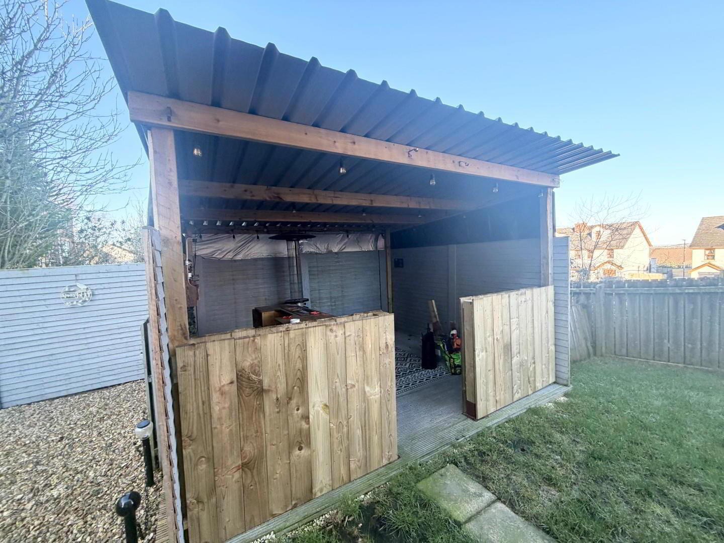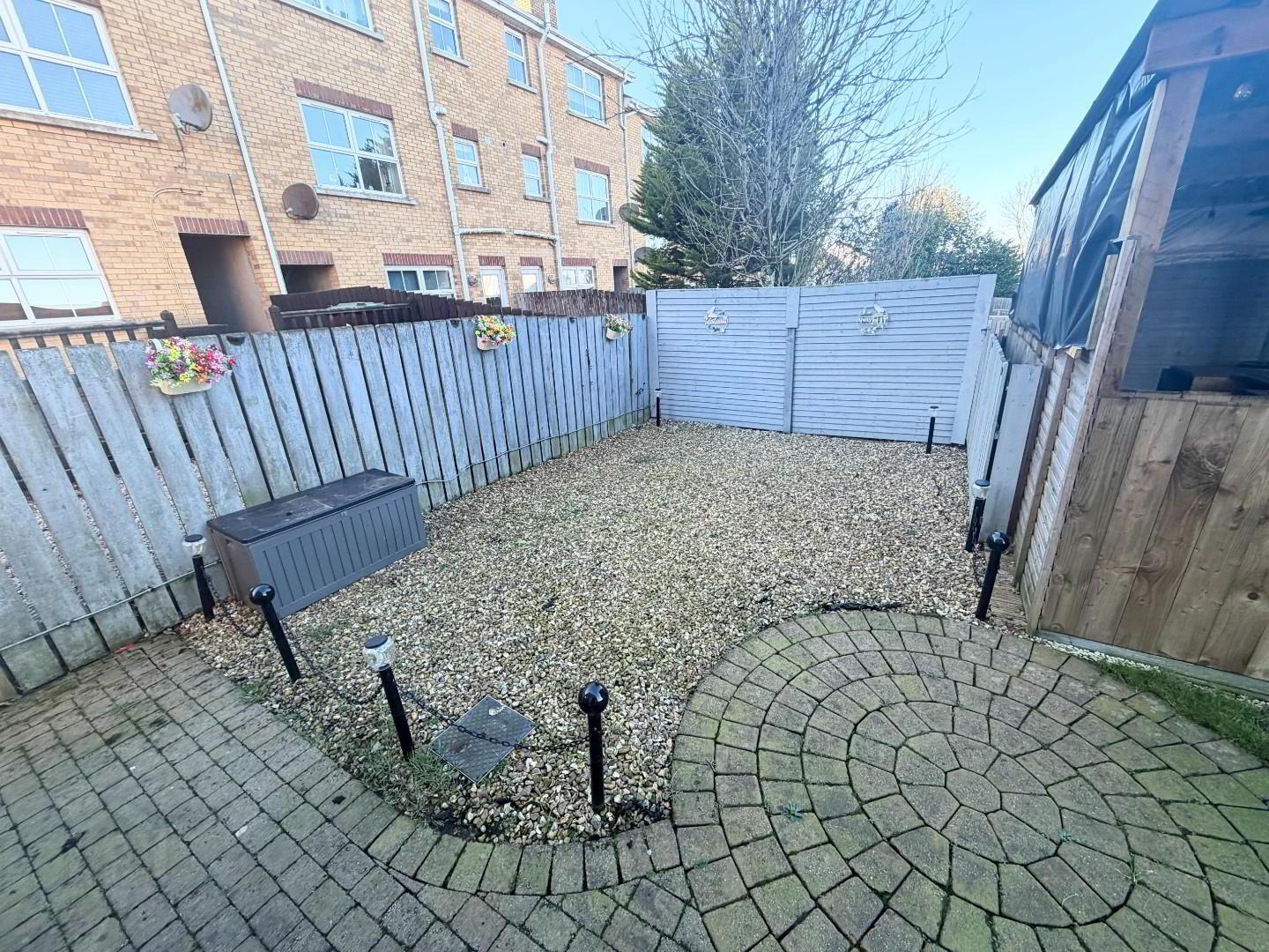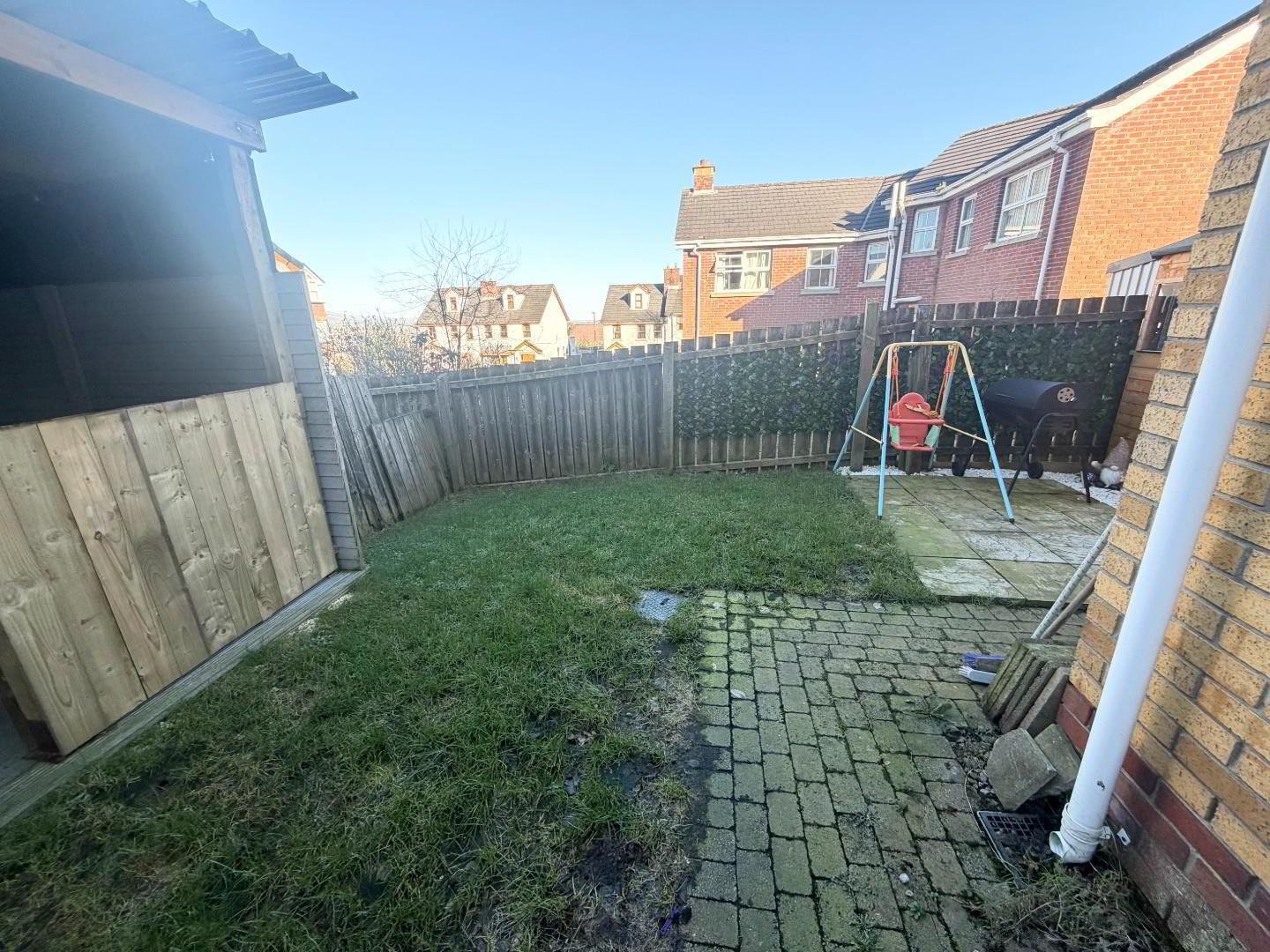 - There is a rear patio area fully enclosed , with a man cave and a storage shed. there is a front lawn and drive for 2 cars.