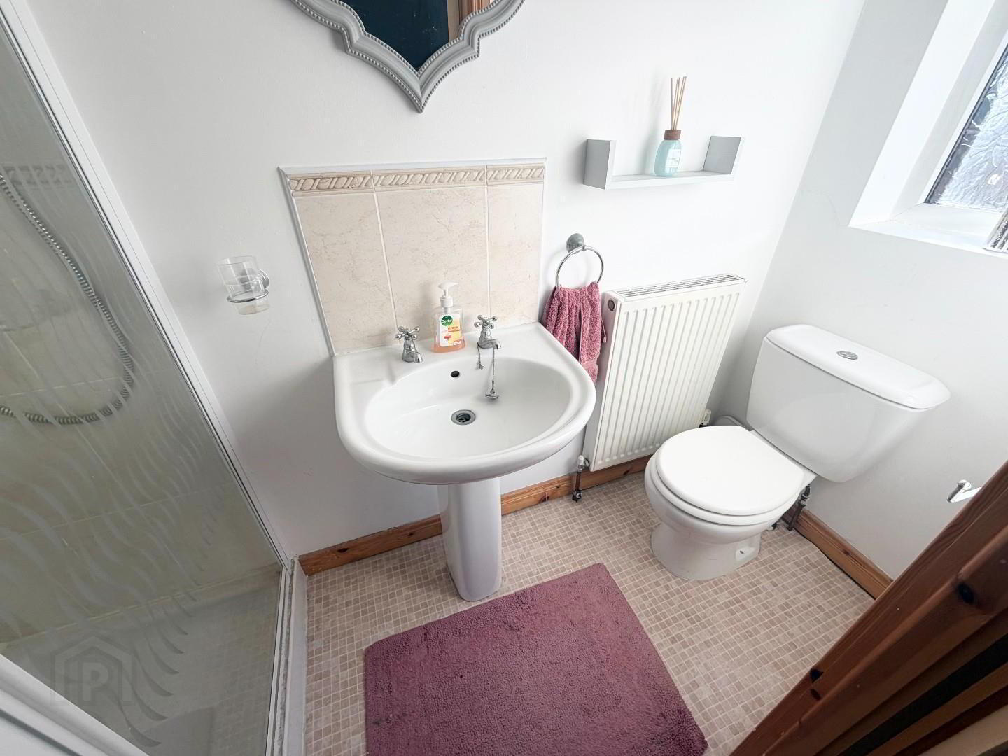 - White suite with LFWC, pedestal wash hand basin, and shower unit fully tiled with mains shower and glass doors. extractor,