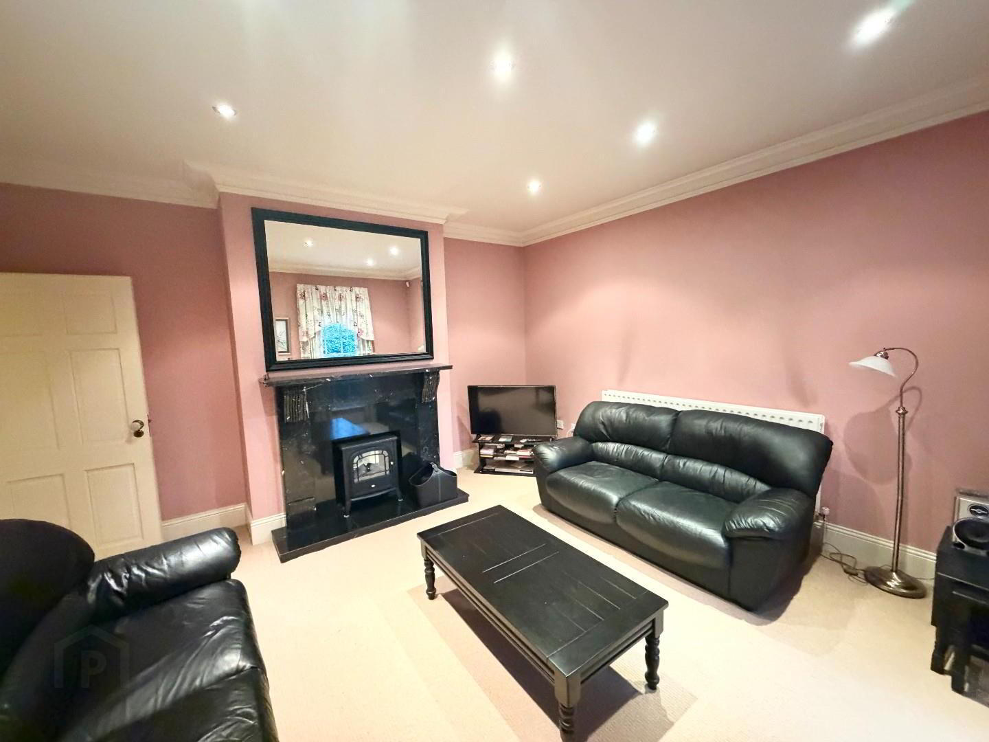 - Bright spacious room with recessed lights and ceiling cornicing and rose, white marble fireplace and matching hearth with gas fire. Carpet flooring.