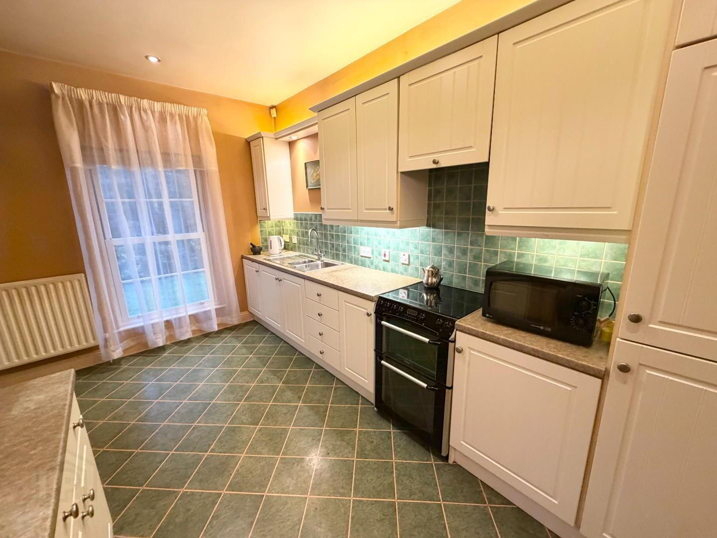 - This is an L-shaped room with high and low level modern units, 11/2 stainless steel sink and drainer, wired for an electric cooker with extractor above, integrated fridge freezer. Part tiled wall and linoleum flooring.