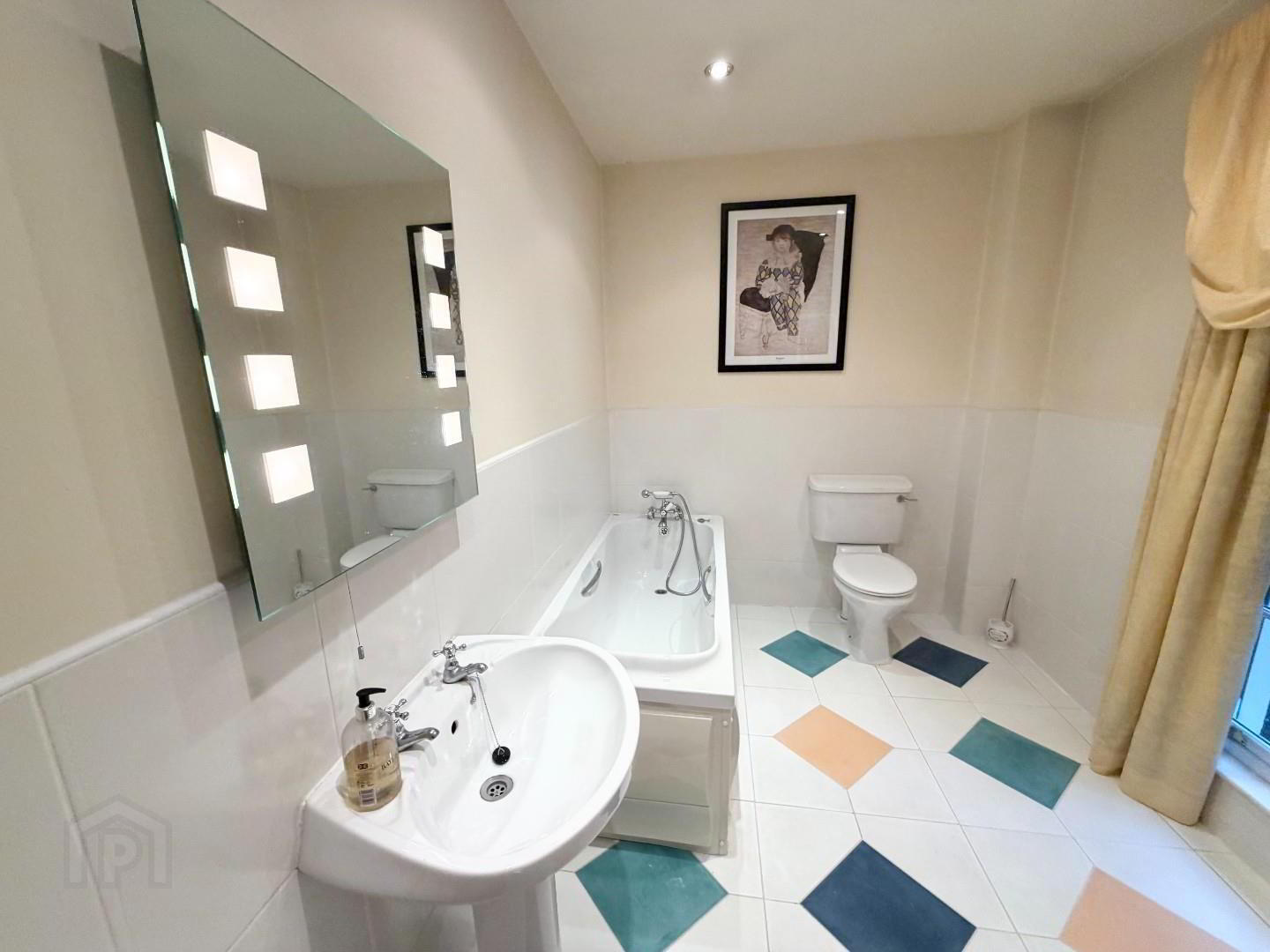 - White suite with panel bath, pedestal wash hand basin, LFWC, radiator, mirror with back light, tiled floor. Shower pod with glass sliding doors and an electric shower.