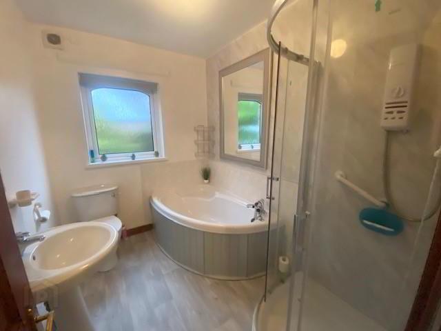 - White suite consisting of LFWC, pedestal wash hand basin, panel bath, corner shower with electric shower and glass doors in a fully paneled unit, extractor with laminate flooring & part paneled wall.