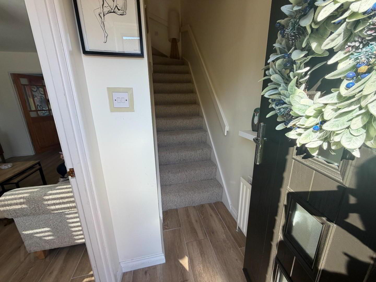 - Bright spacious room with new tiling on floor, open fire with back boiler, wood surround, and tiled hearth. Under stairs storage.