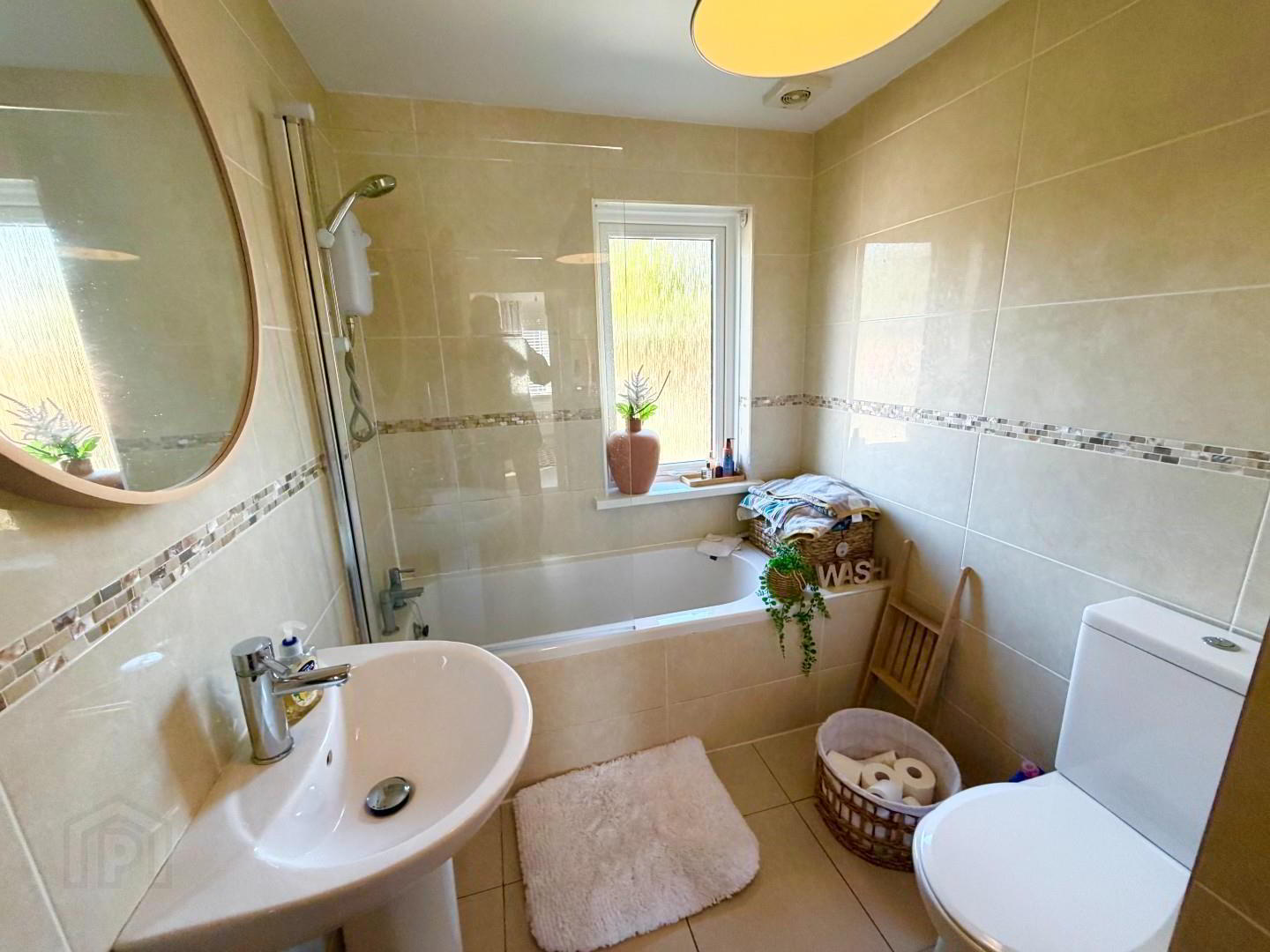 - White suite comprising, LFWC, pedestal wash hand basin, panel bath with new electric shower above and glass shower screen. Chrome towel Rad and extractor with fully tiled floor and walls. Hotpress shelved.