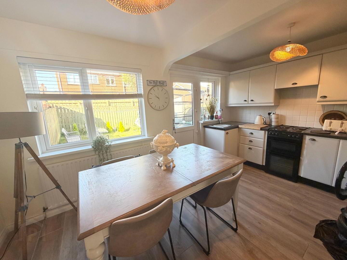 - Great sized room with modern kitchen and high and low level units, stainless steel sink and drainer, electric cooker with extractor above, fridge freezer and space for washing machine,, again the new tiles on floor and part tiled wall, door to enclosed rear garden.