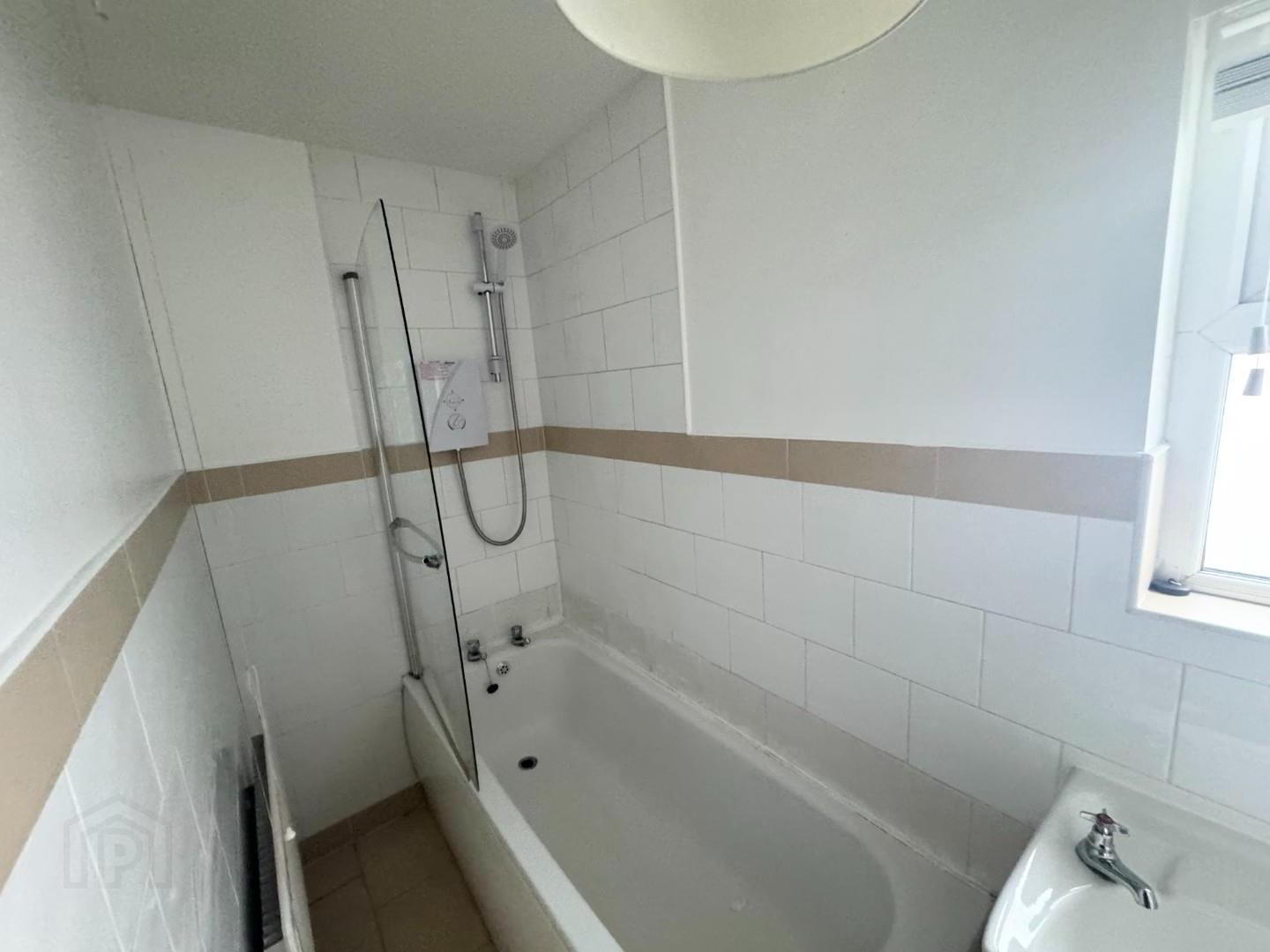 - White suite comprising LFWC, pedestal wash hand basin, panel bath and electric shower above, glass shower screen, tiled floor and part tiled wall, extractor and radiator.