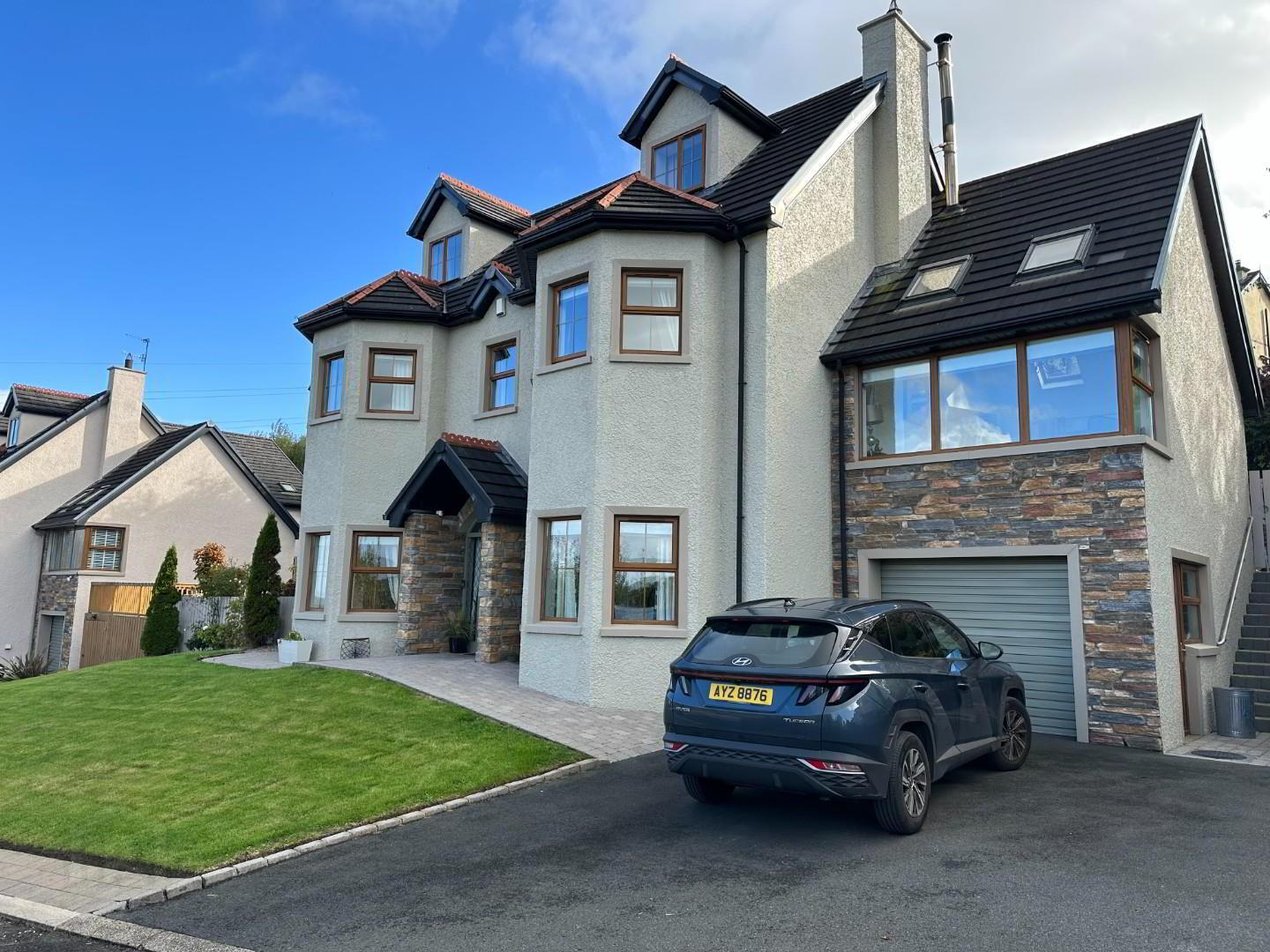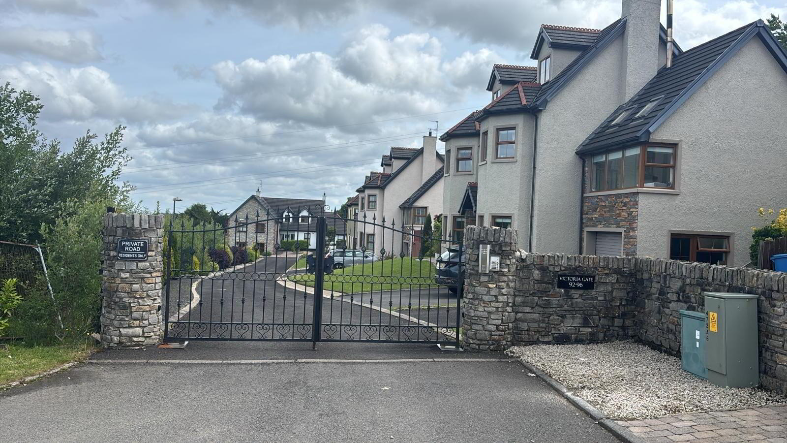The front of the house has a lawn area , this is a gated complex containing 5 houses exclusively . there is electric gates which work from your phone to provide extra security.