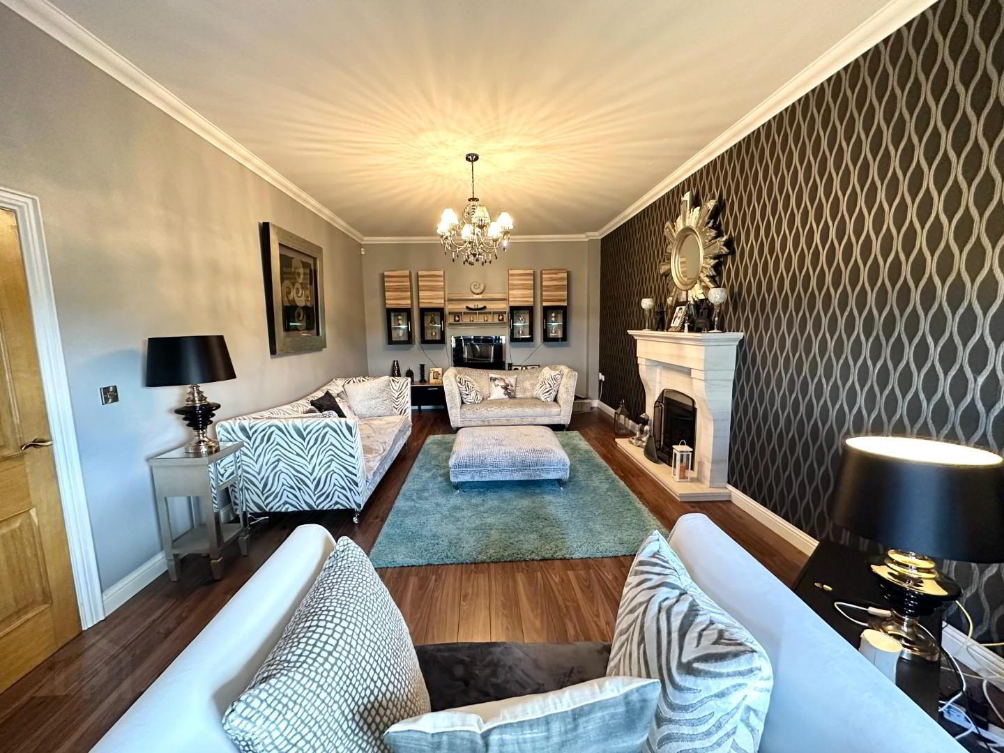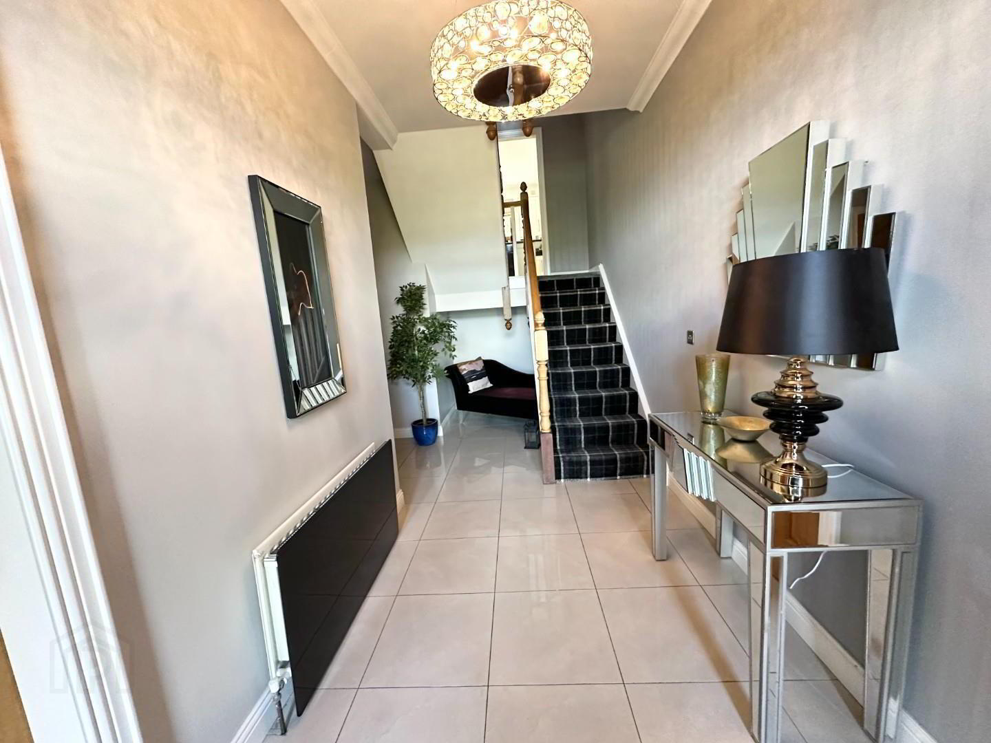 - Solid wood door to bright hallway with fully tiled flooring and ceiling cornicing.