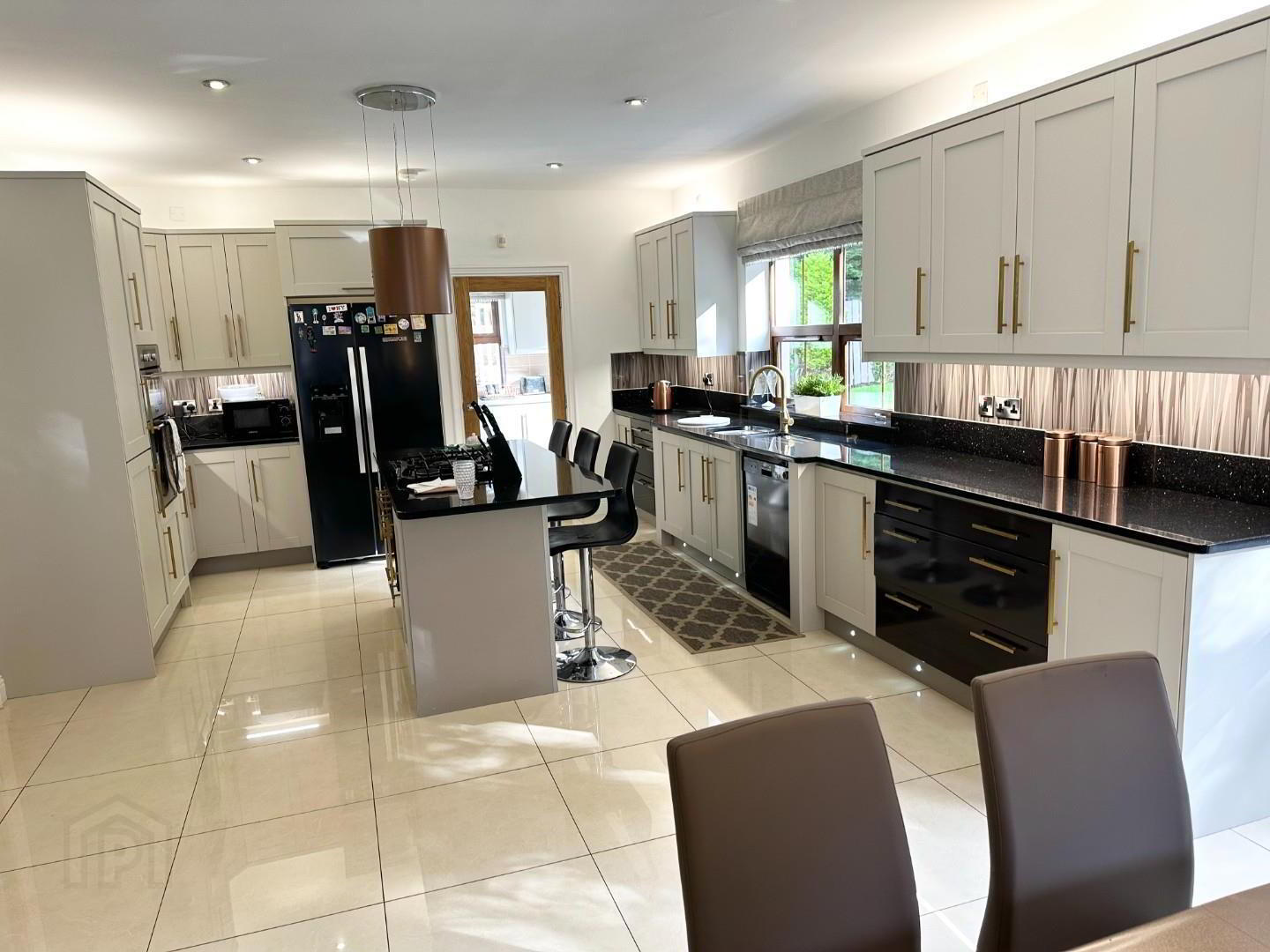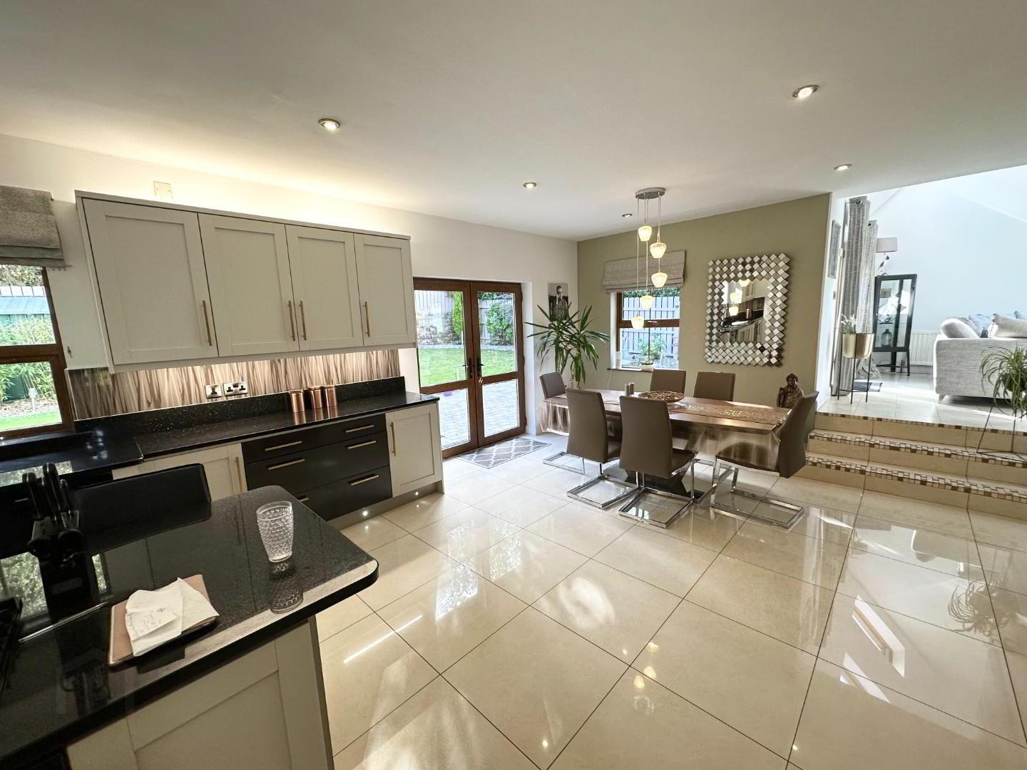 - This expansive room has a refurbished kitchen with High and low level units, 11/2 stainless steel tub sinks set in a granite work top, large island with granite work top and gas hob with bespoke extractor above. There are integrated double ovens, plumbed for an American fridge freezer, and plumbed for a dish washer. Fully tiled floor and part tiled wall, recessed lights as well as feature hanging lights, double door to patio and garden. and 3 steps to the sun lounge.