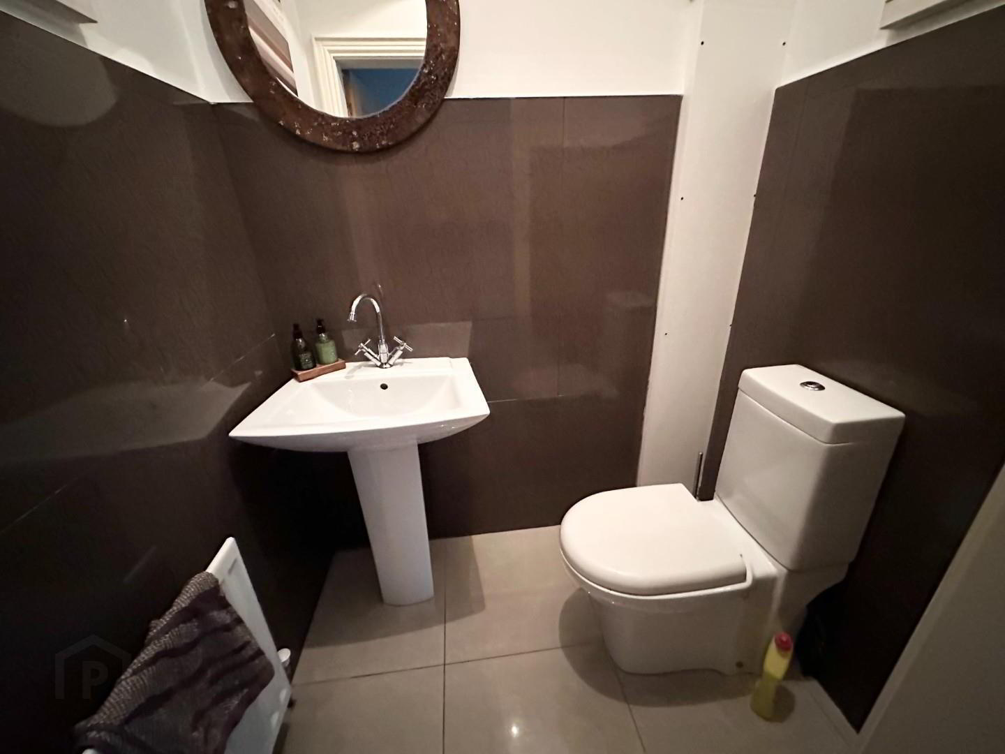 - This ground floor toilet is situated beside the study to save time , LFWC and pedestal wash hand basin, fully tiled floor, part tiled wall, extractor.