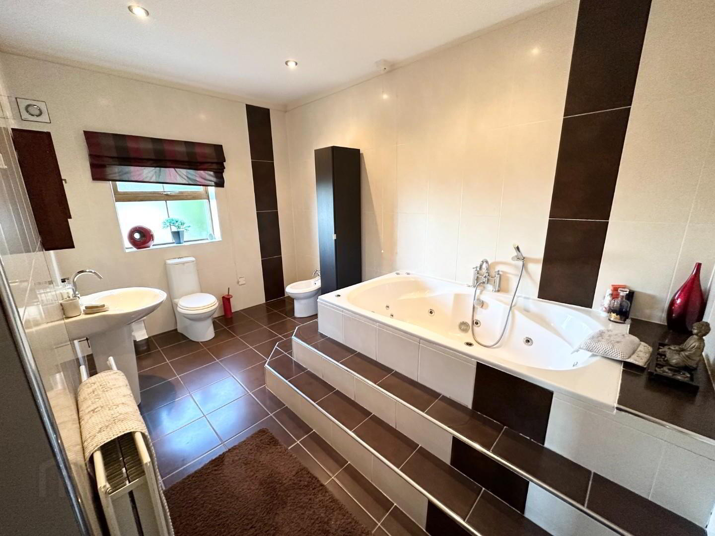 - This spacious modern bathroom is fully tiled wall and floor, with feature double jacuzzi bath, LFWC, Pedestal wash hand basin, and BI-Day, 2 radiators one of which is chrome and extractor and recessed lights.