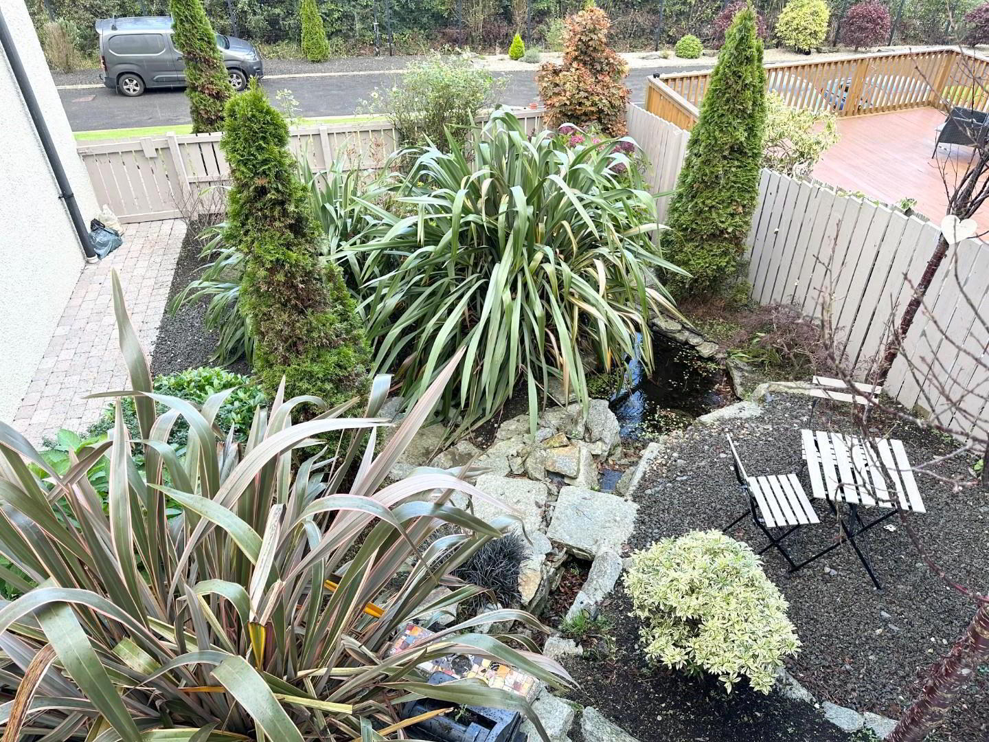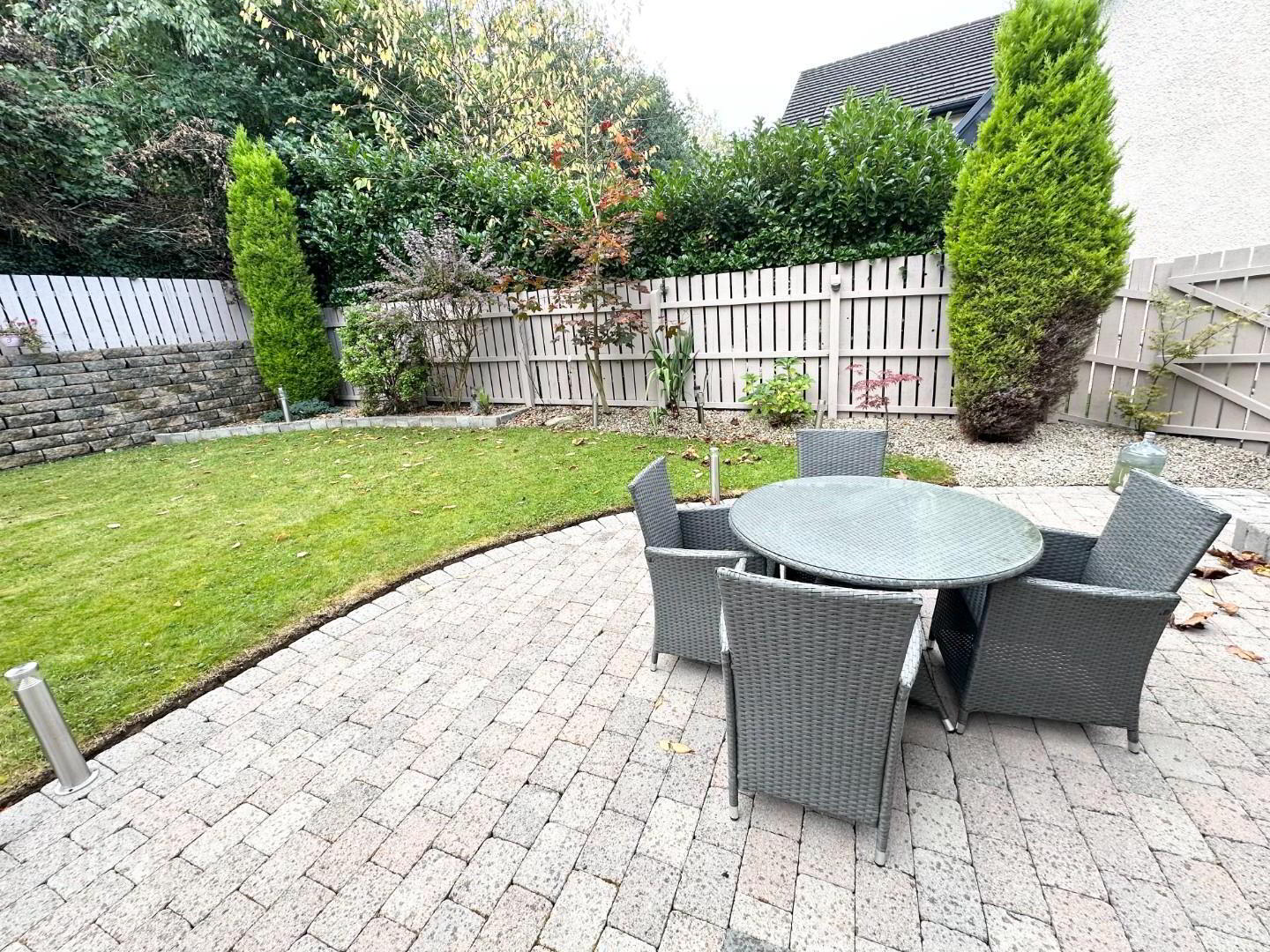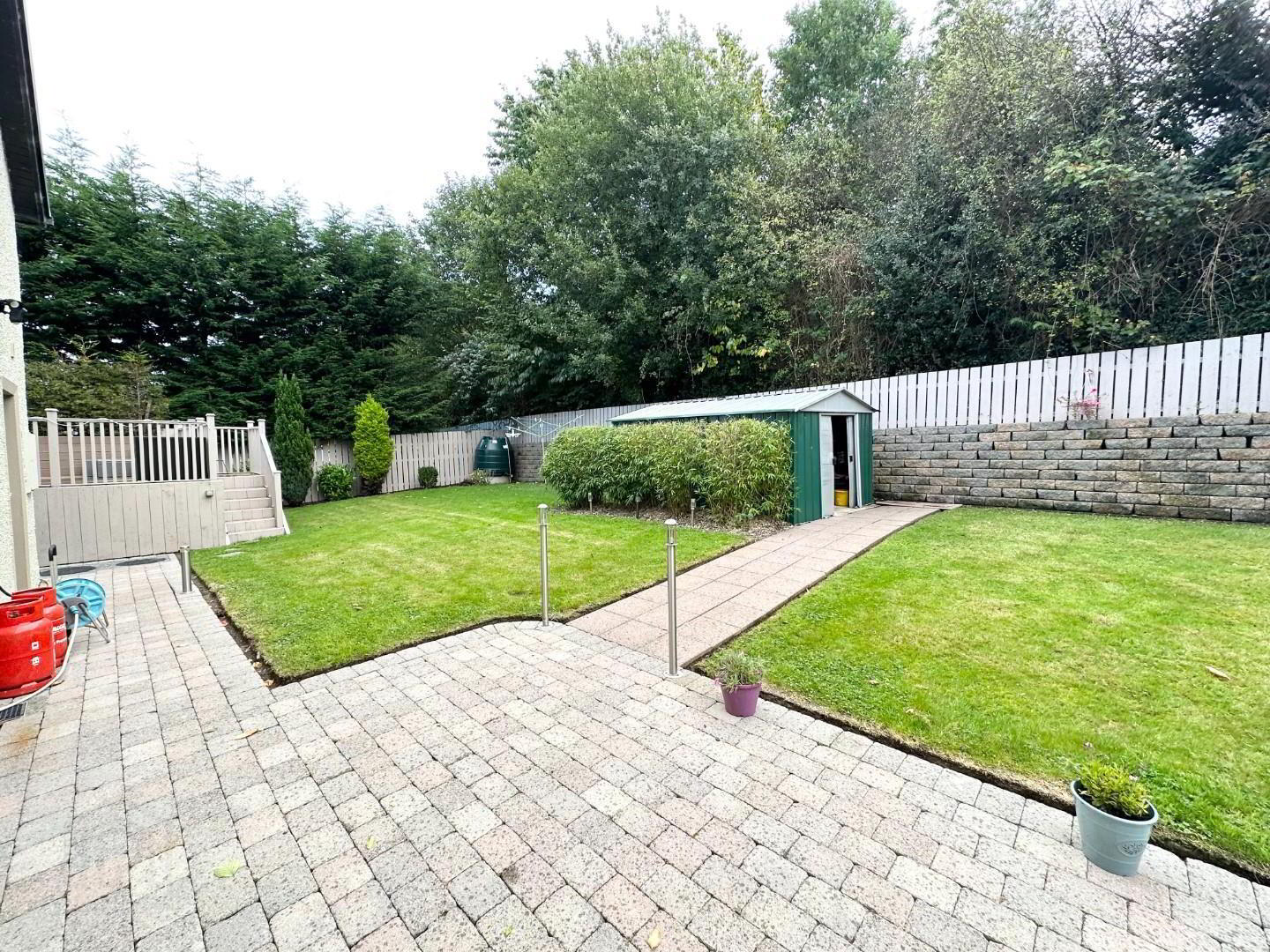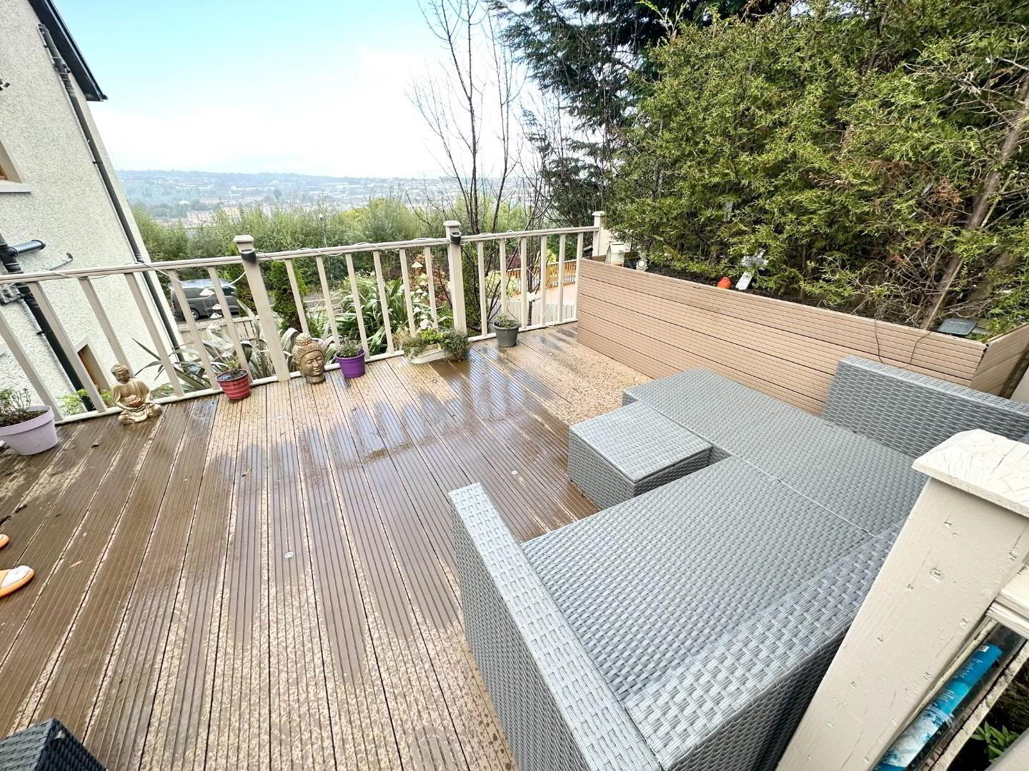 - The rear garden is very private and gets the sun all day when we get it (LOL) there is a lawn area plus a paved patio area and a decking area ideal for viewing the city and eating breakfast, there is a water feature with shrubs in the landscaped area.