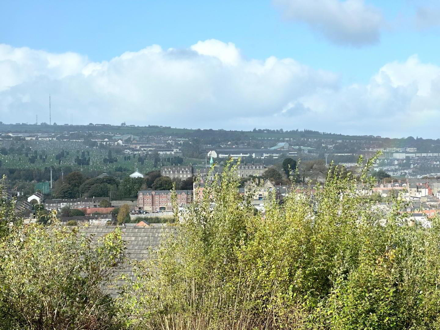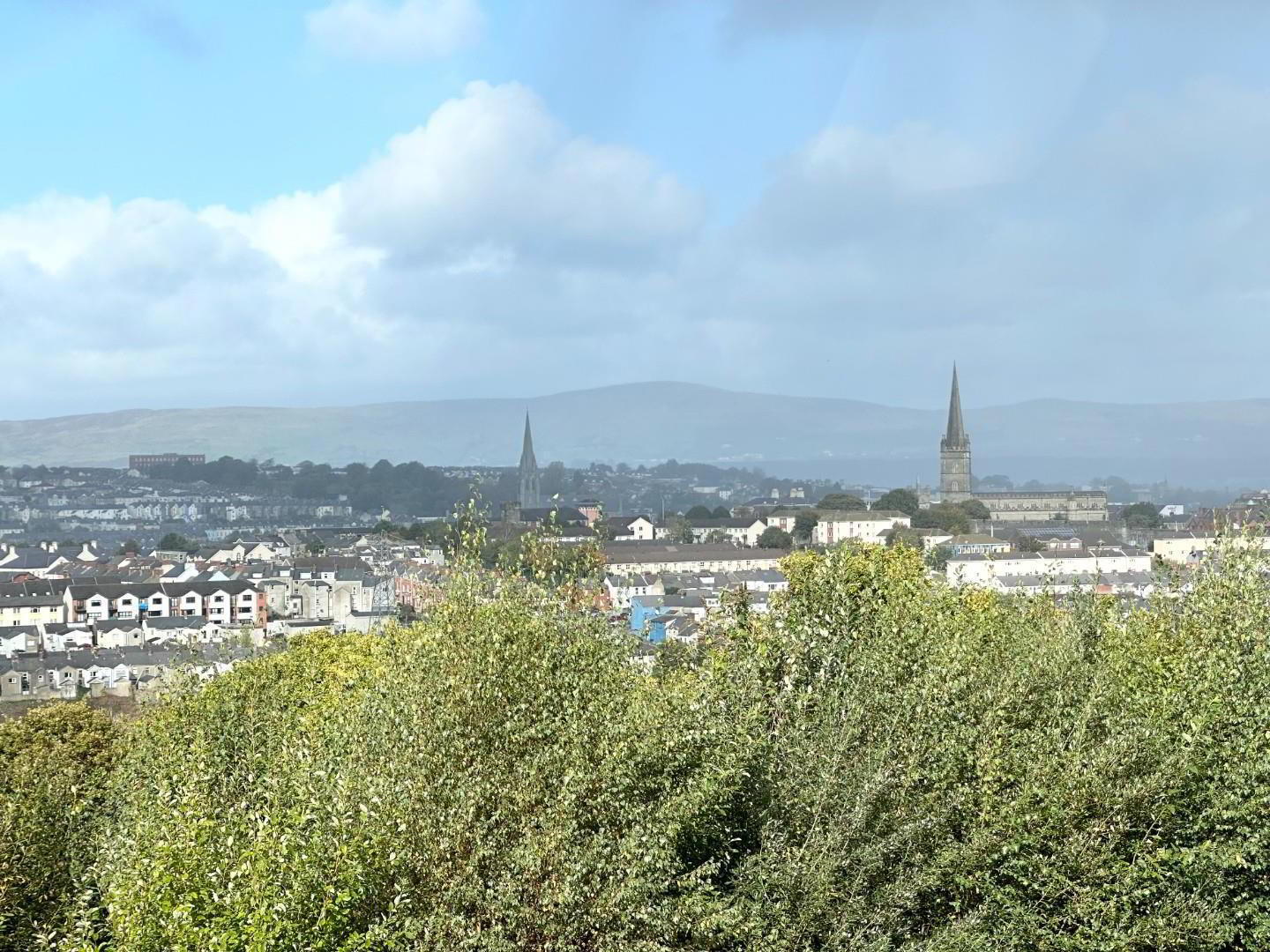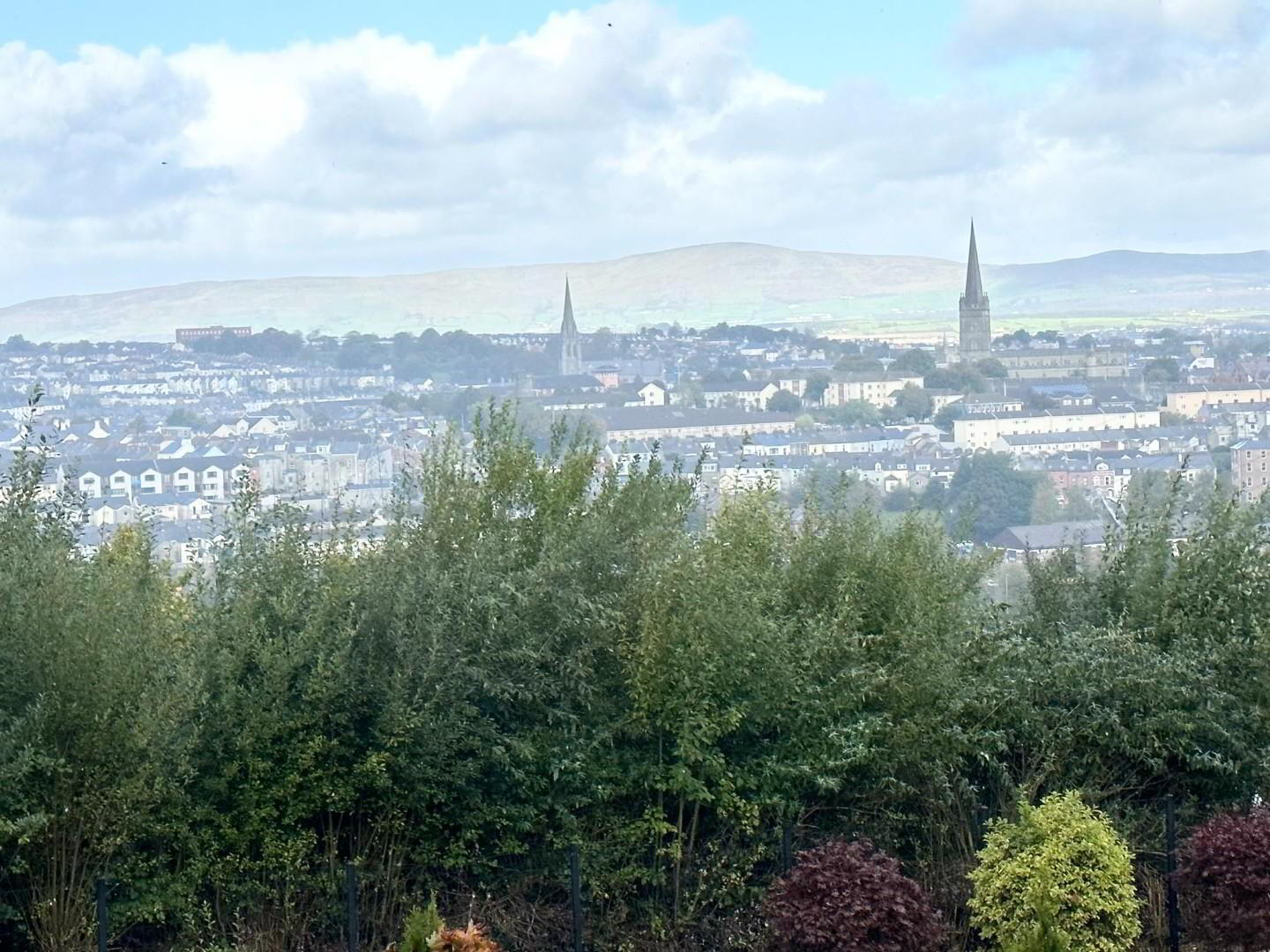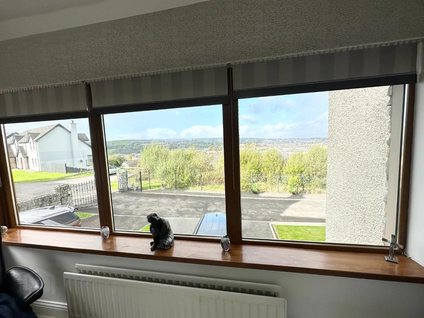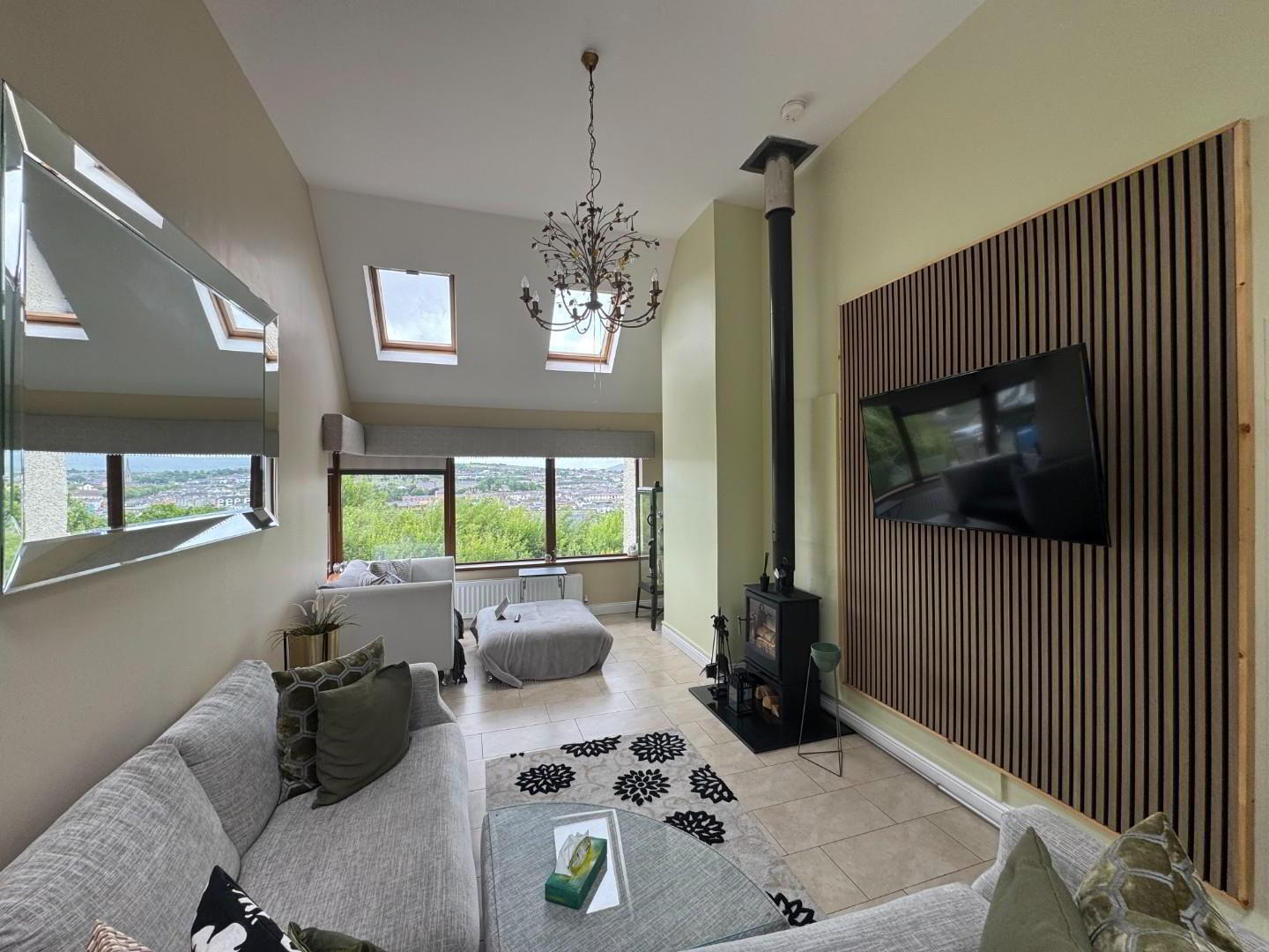 - Large bright sun lounge with picture postcard views across the city, fully tiled floor , solid fuel stove and double doors to the patio and garden. Velux windows