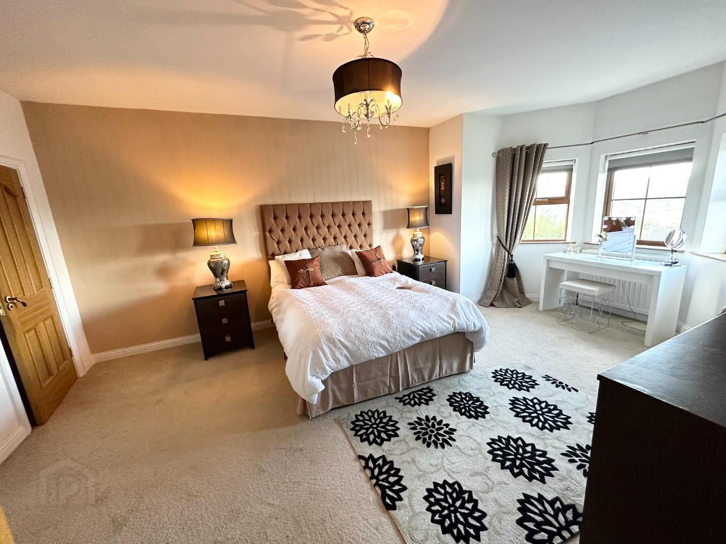 - This large double room has carpet flooring, bay windows with city views and a walk in robe and en-suite bathroom