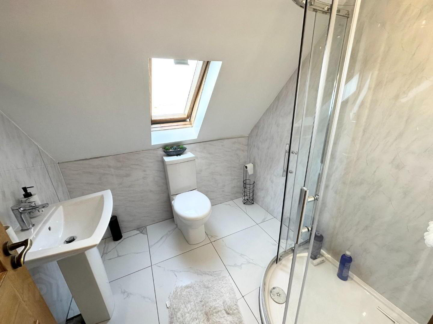 - White suite with LFWC, pedestal wash hand basin, corner shower unit with pressure shower and glass doors, fully tiled wall and tiled floor, extractor and velux window.