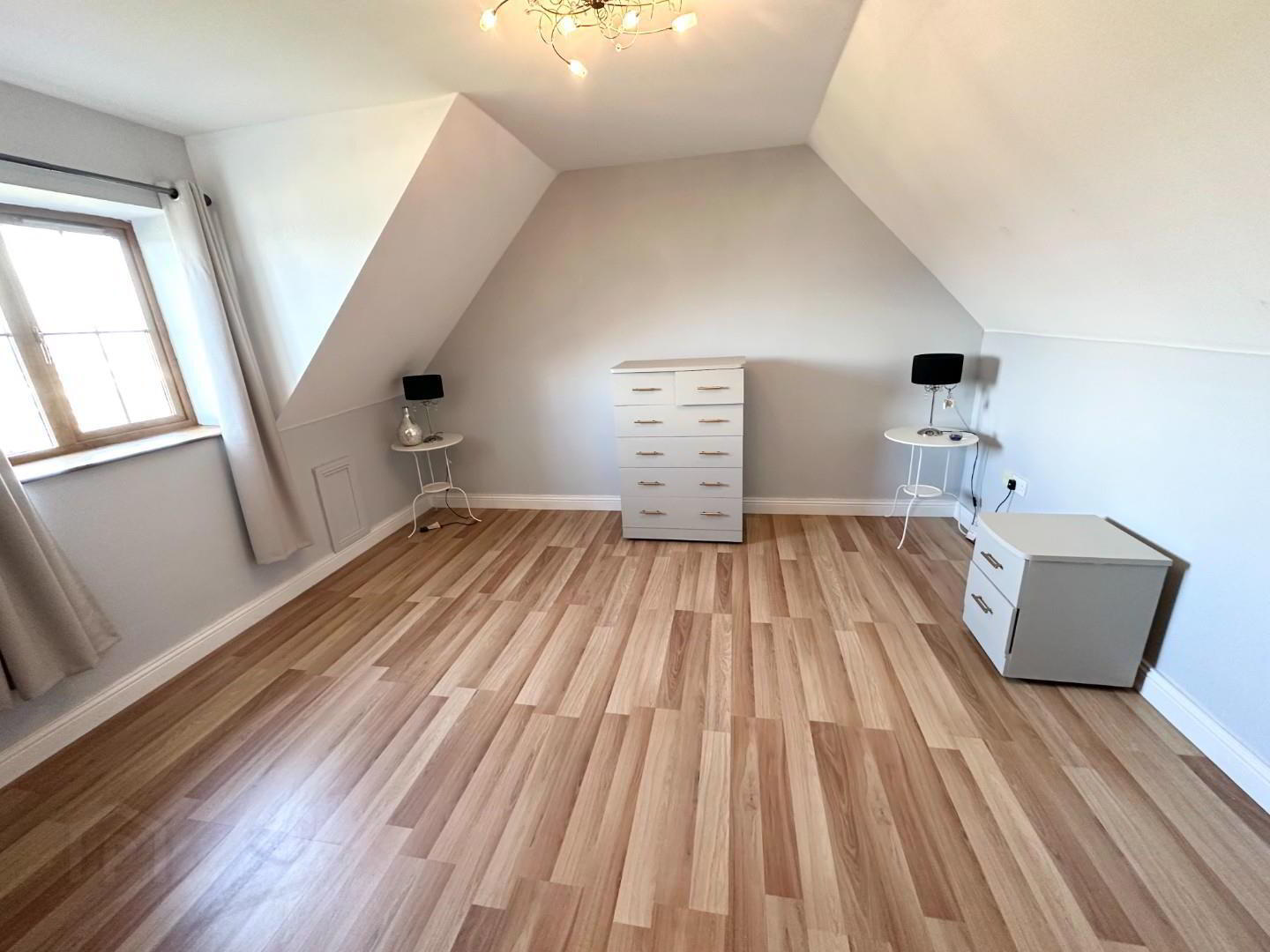 - Another large room with 10ft ceilings and grey laminate flooring and ceiling cornicing. Bay window with city views.